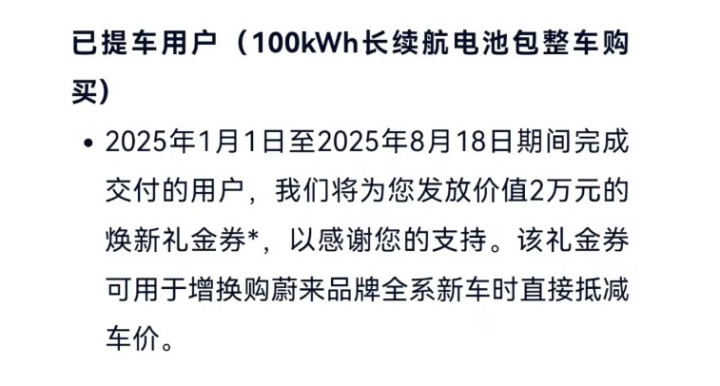 老用户也没有“背刺”。对于已购车用户,蔚来采取了差异化补偿措施。2025年1月1日至2025年8月18日期间完成续航永久升级的用户,将获得价值2万元的焕新礼金券,用户后期增换购蔚来品牌全新新车时直接抵减车价,有效期5年。